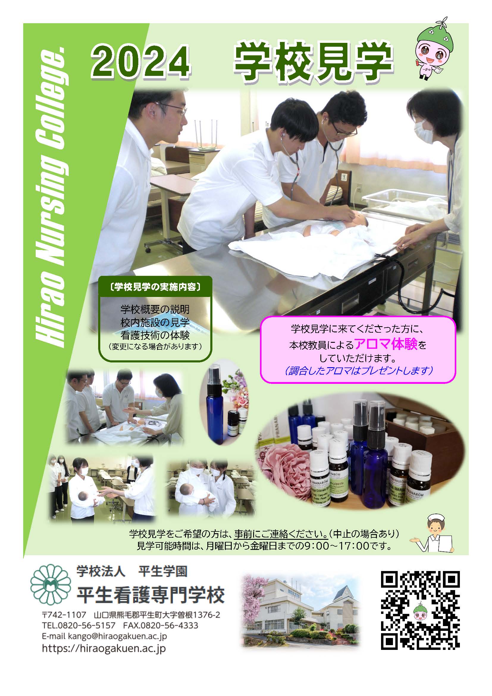 2024.07.24 お知らせ 学校見学について 本校では、学校の見学、説明を随時行っています。 今年度は、シミュレーション人形を使用したバイタルサイン測定や、アロマ体験を企画しております。日程の調整をさせて頂きますので、事前にご連絡頂けると幸いです。お待ちしています。 ※クリックすると、全画面でご確認頂けます。